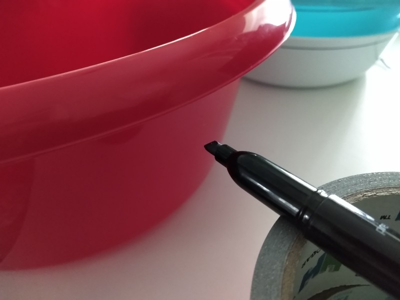 Lo primero, eliminar los rebordes innecesarios. Y eso plantea un proble (y grave) porque no tengo las mejores herramientas del mundo y trabajar con volúmenes curvos es siempre complicado. Para asegurar un corte recto y regular, seguiremos una marca, que hacemos con un rotulador indeleble apoyado sobre un rollo de cinta (hasta alcanzar la altura deseada). Colocamos al lado el barreño, en una superficie lisa y limpia, apoyamos contra el rotulador, y lo vamos girando sobre la mesa para que el rotulador vaya pintando: (011)